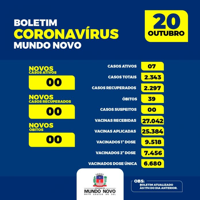 Há 70 dias sem nenhum óbito no município decorrente da coivid-19, a internação em Unidade de Terapia Intensiva sempre preocupa. Os dois pacientes estão em Dourados. Na terça-feira não houve novos casos e Mundo Novo permanece com sete ativos.
