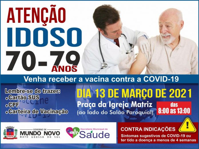 Na vacinação a informação é que 200 doses estão preparadas para imunizar os idosos de 70 a 79 anos autônomo, neste sábado (13), na Praça da Igreja Matriz, ao lado do Salão Paroquial. Os idosos de 70 a 79 acamados e domiciliados já foram vacinados, desde o último dia 04 (183 receberam a primeira imunização).
