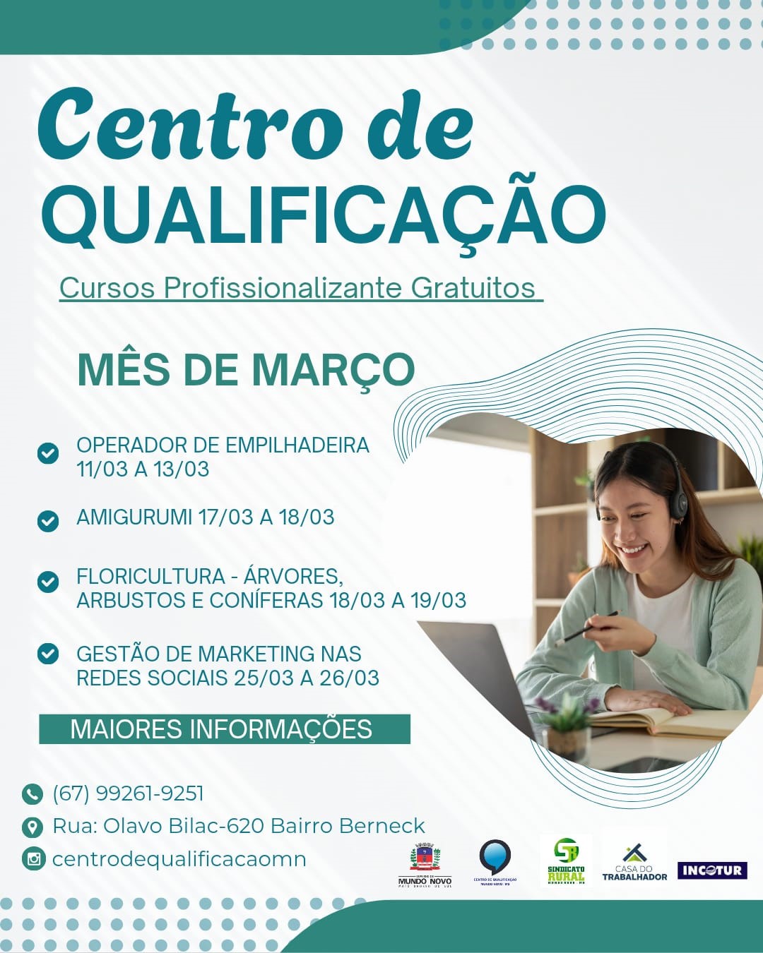 Nesta quinta-feira (20), o Centro de Qualificação Profissional e Social de Mundo Novo anunciou cursos profissionalizantes gratuitos para o mês de março, que variam de 2 a 3 dias de qualificação.