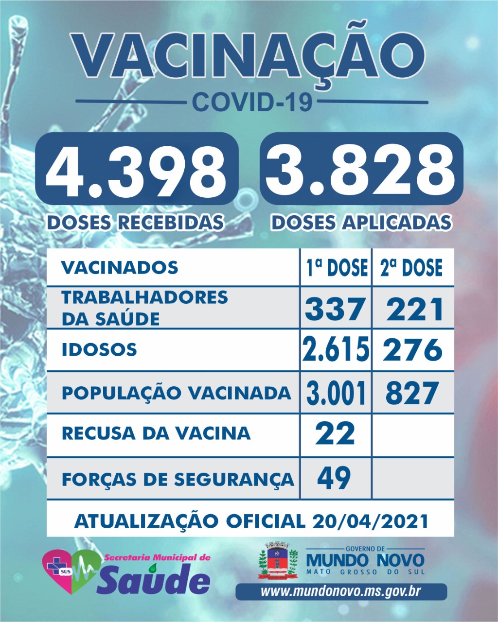 Na segunda (19), 132 aplicações foram realizadas: 127 de segunda dose da CoronaVac (10 Bombeiros e 117 idosos a partir de 60 anos) e cinco de primeira imunização da AstraZeneca (um de força de segurança e quatro idosos a partir de 60). Mais de três mil mundonovenses já tomaram a primeira dose contra a covid-19.