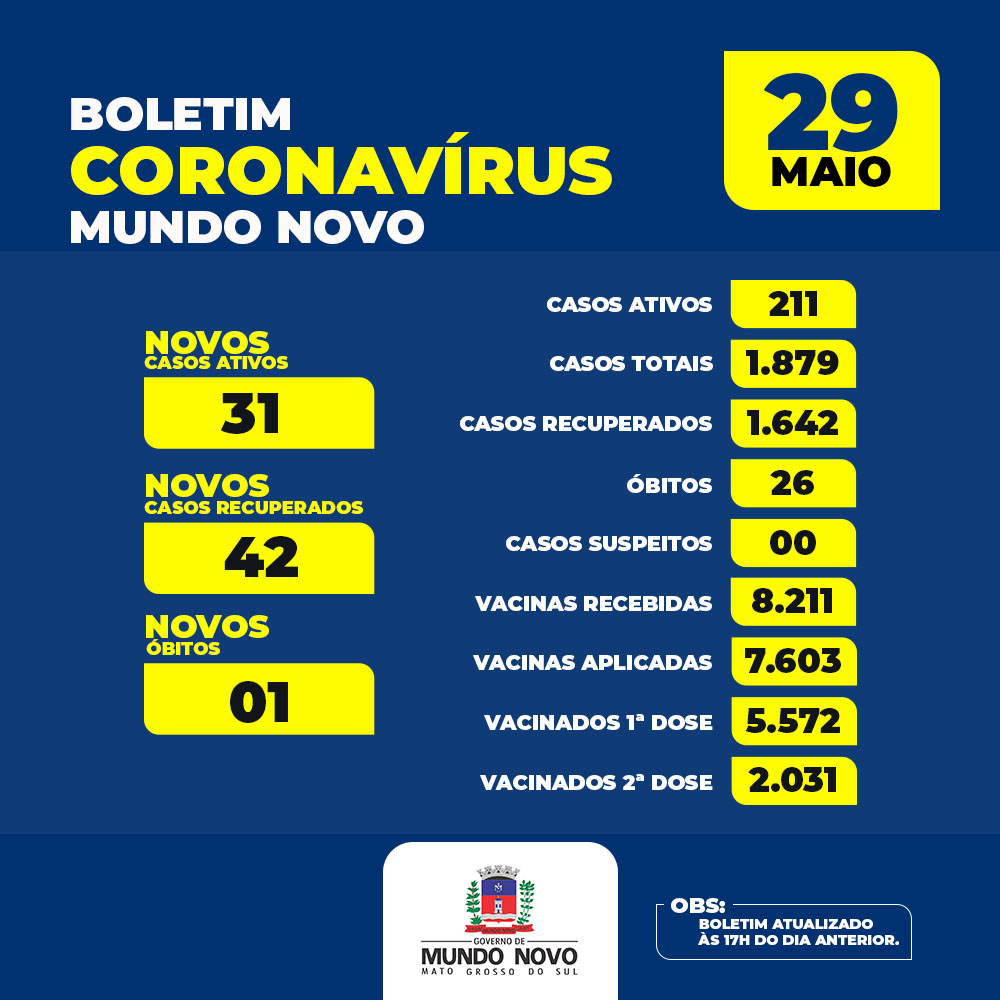 Boletim Coronavírus 29/05/21 – atualizado às 17h00 do dia anterior
