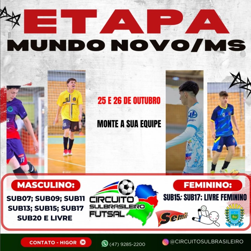 Nos dias 25 e 26 de outubro, Mundo Novo será sede de um grande evento, a etapa do Circuito Sul Brasileiro de Futsal. As inscrições devem ser feitas pelo WhatsApp (47) 992852200 – Higor.