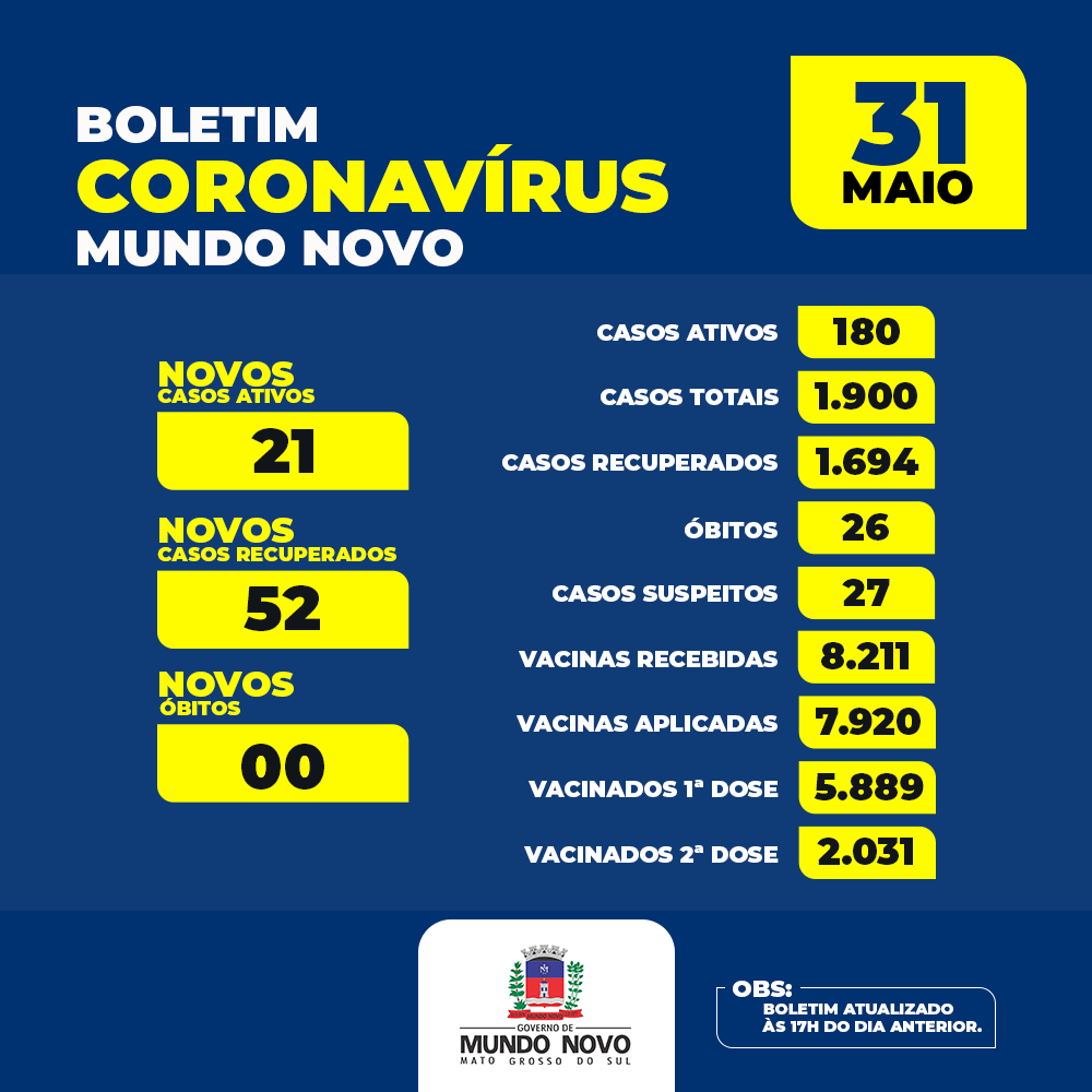 Boletim Coronavírus 31/05/21 – atualizado às 17h00 do dia anterior