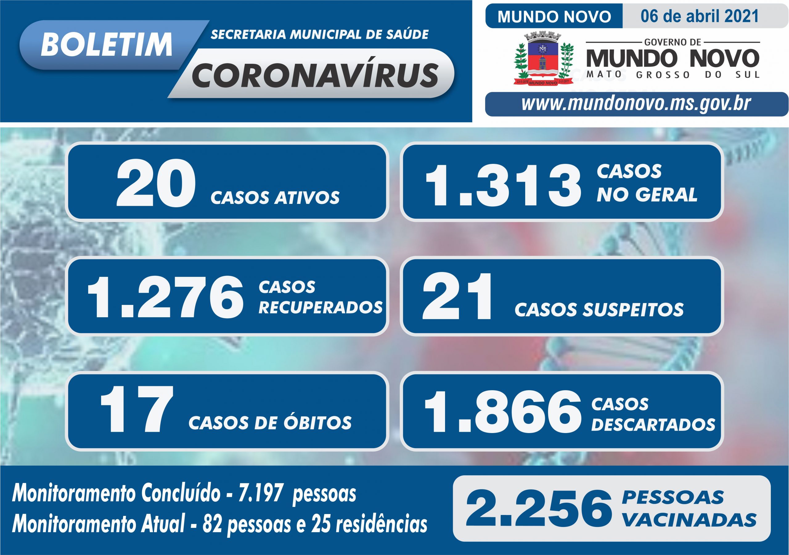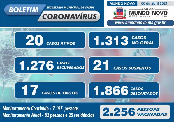 Mundo Novo atualizou o seu Boletim Coronavírus nesta terça-feira (06) com os dados das centrais de Monitoramento, Triagem e Vacinação. A Secretaria Municipal de Saúde fechou a segunda-feira com 20 ativos da doença.