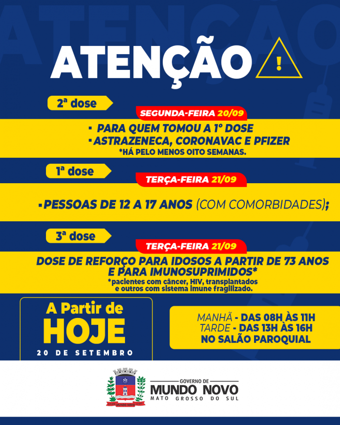 Na terça-feira, será a vez de primeira dose para pessoas de 12 a 17 anos e dose de reforço (3ª dose) para idosos a partir 73 anos. O horário de atendimento é das 8h00 às 11h00 e das 13h00 às 16h00 ou enquanto durar o estoque.