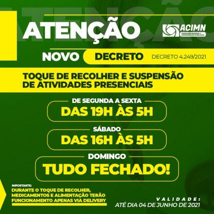 A partir da próxima segunda-feira até a sexta-feira (04) o toque de recolher começará às 19h00.