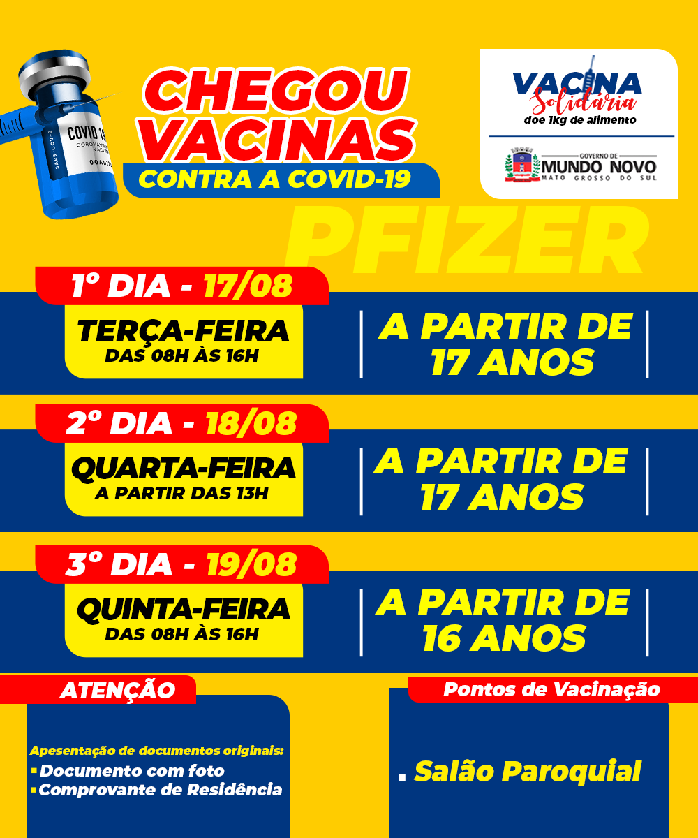 A vacinação para pessoas de 17 anos continua nesta terça. Na próxima quinta-feira, pessoas com 16 anos estarão autorizadas para tomar. Devem levar cartão do Sus, carteirinha de vacinação e documento de identidade.