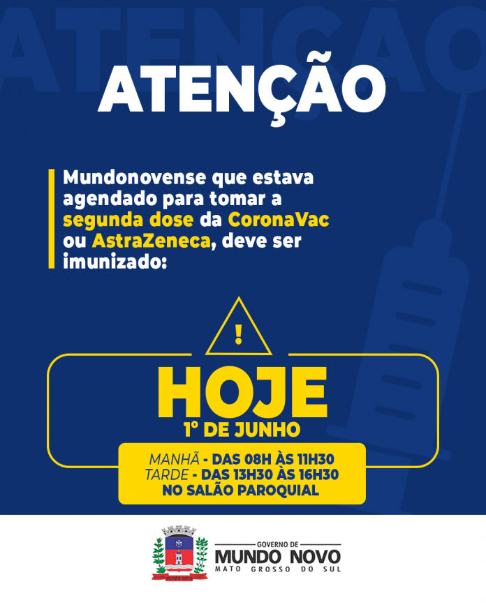 Desta feita, os mundonovenses que estavam agendados para maio e tinham o seu esquema vacinal atrasado – pela falta de envio de vacinas pelo Ministério da Saúde -, podem se deslocar para o Salão Paroquial, no Centro da cidade. O horário de atendimento no local é das 8h00 às 11h e das 13h30 às 16h30.