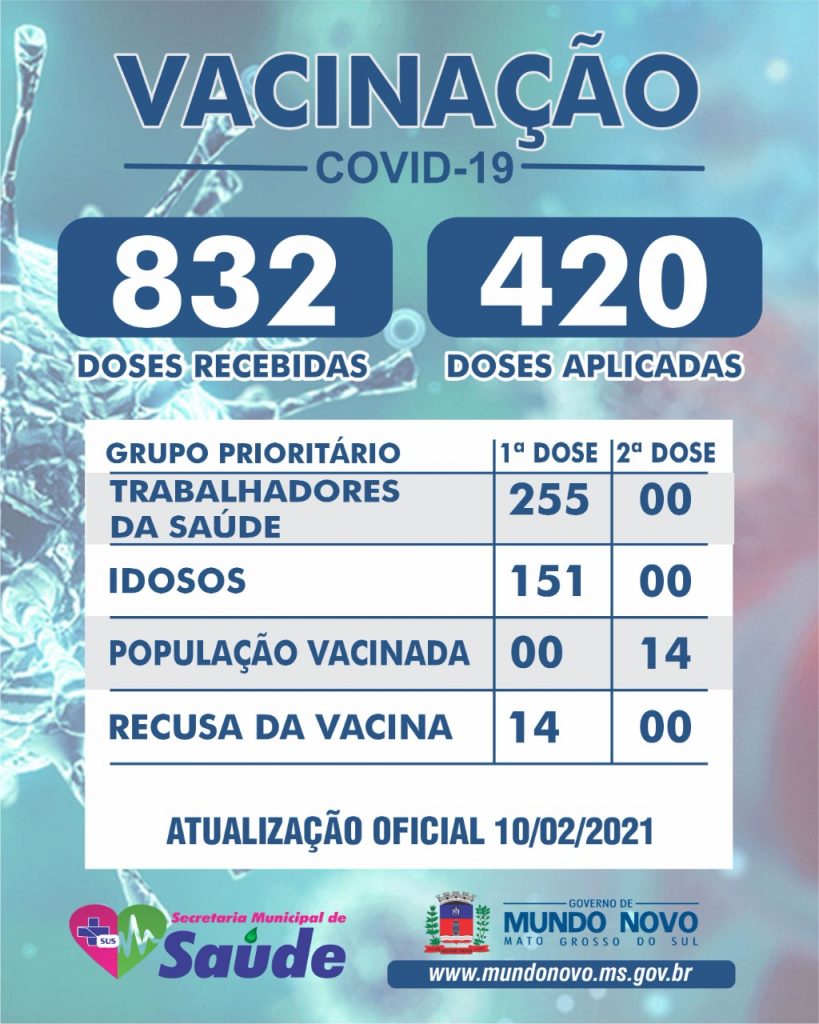 A Secretaria Municipal de Saúde informou que mais de 400 pessoas já receberam a primeira dose da vacina contra a Covid-19, seja da CoronaVac ou da AstraZeneca.