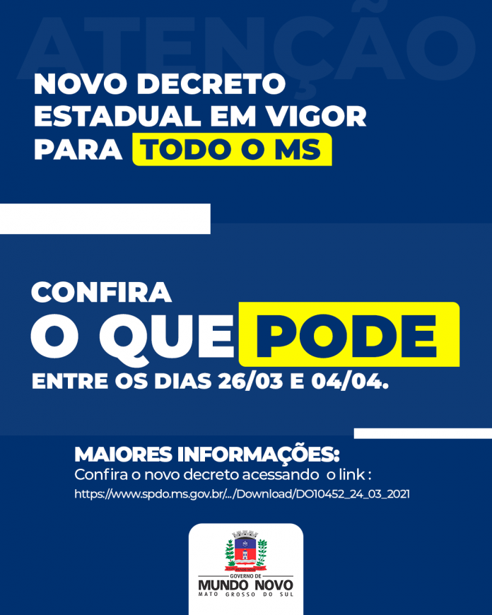O novo decreto estadual com medidas mais restritivas para combater a Covid-19 entrou em vigor nesta sexta-feira (26) para todo o Mato Grosso do Sul e tem validade até o dia 04 de abril (domingo). O decreto municipal com a adesão entre no Diário Oficial ainda no dia de hoje.