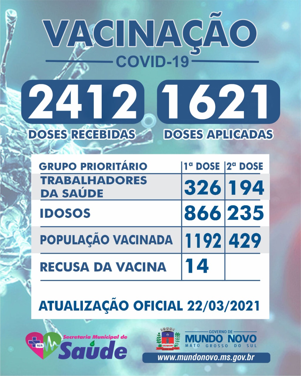 No sábado, a vacinação para idosos de 70 a 79 anos foi retomada. Foram 120 mundonovenses imunizados na primeira dose da CoronaVac. Com a chegada de mais 360 doses, do mesmo laboratório, o município tem uma garantia de vacinação durante toda a semana.