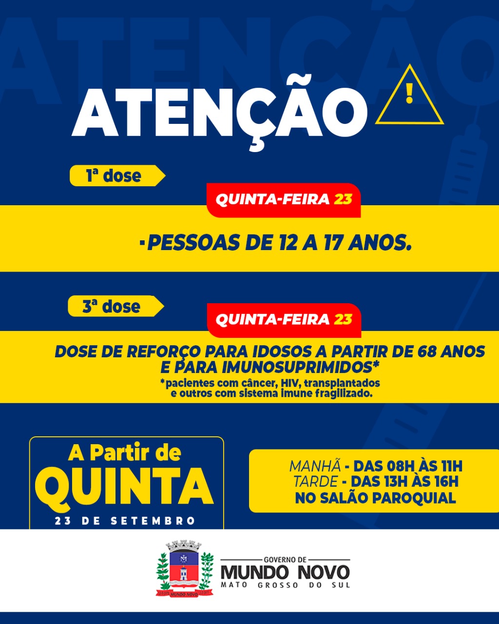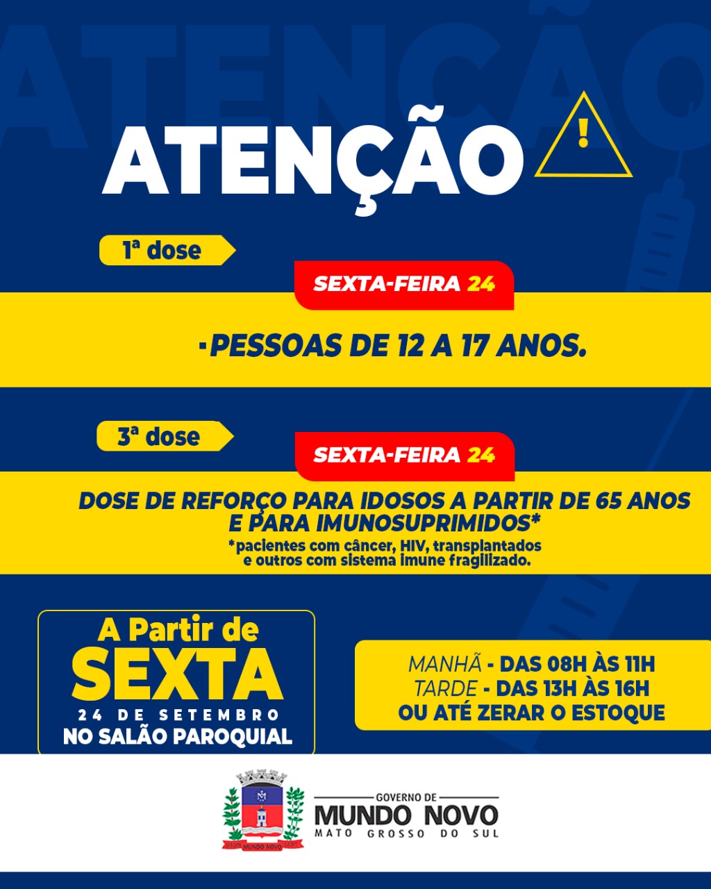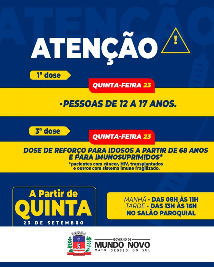 A vacinação contra a covid-19 em Mundo Novo prossegue dando foco a dose de reforço para imunosuprimidos (transplantados, câncer e HIV) e idosos.