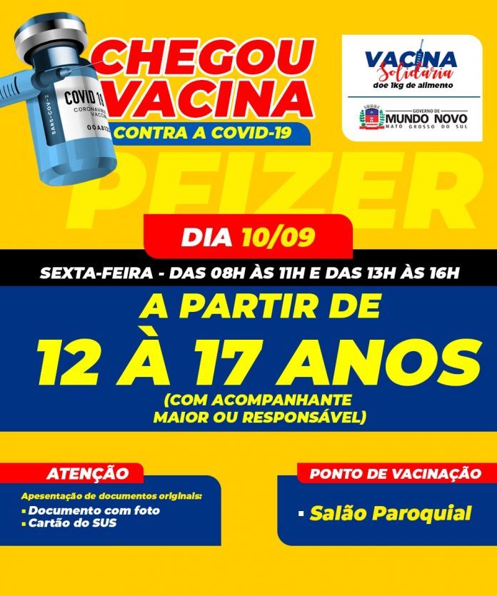 A vacinação contra a covid-19 em Mundo Novo volta a acontecer nesta sexta-feira (10), no Salão Paroquial, no Centro da cidade, das 8h00 às 11h e das 13h às 16h00 ou enquanto durar o estoque de 160 vacinas da Pfizer.