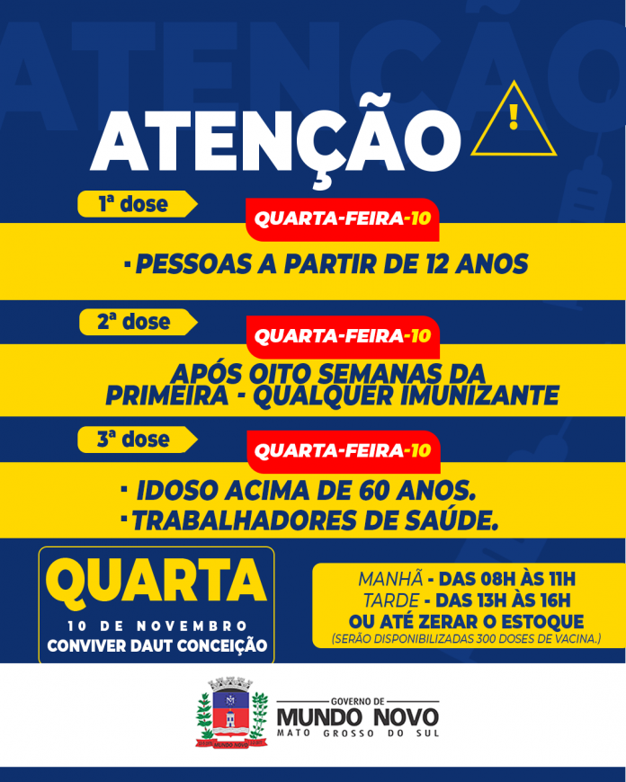 São 300 doses a disposição da população nesta quarta, para primeira dose (pessoas a partir de 12 anos), segunda dose (dois meses após a primeira) e dose de reforço (idosos (60 anos +), transplantados e pacientes com câncer ou HIV).