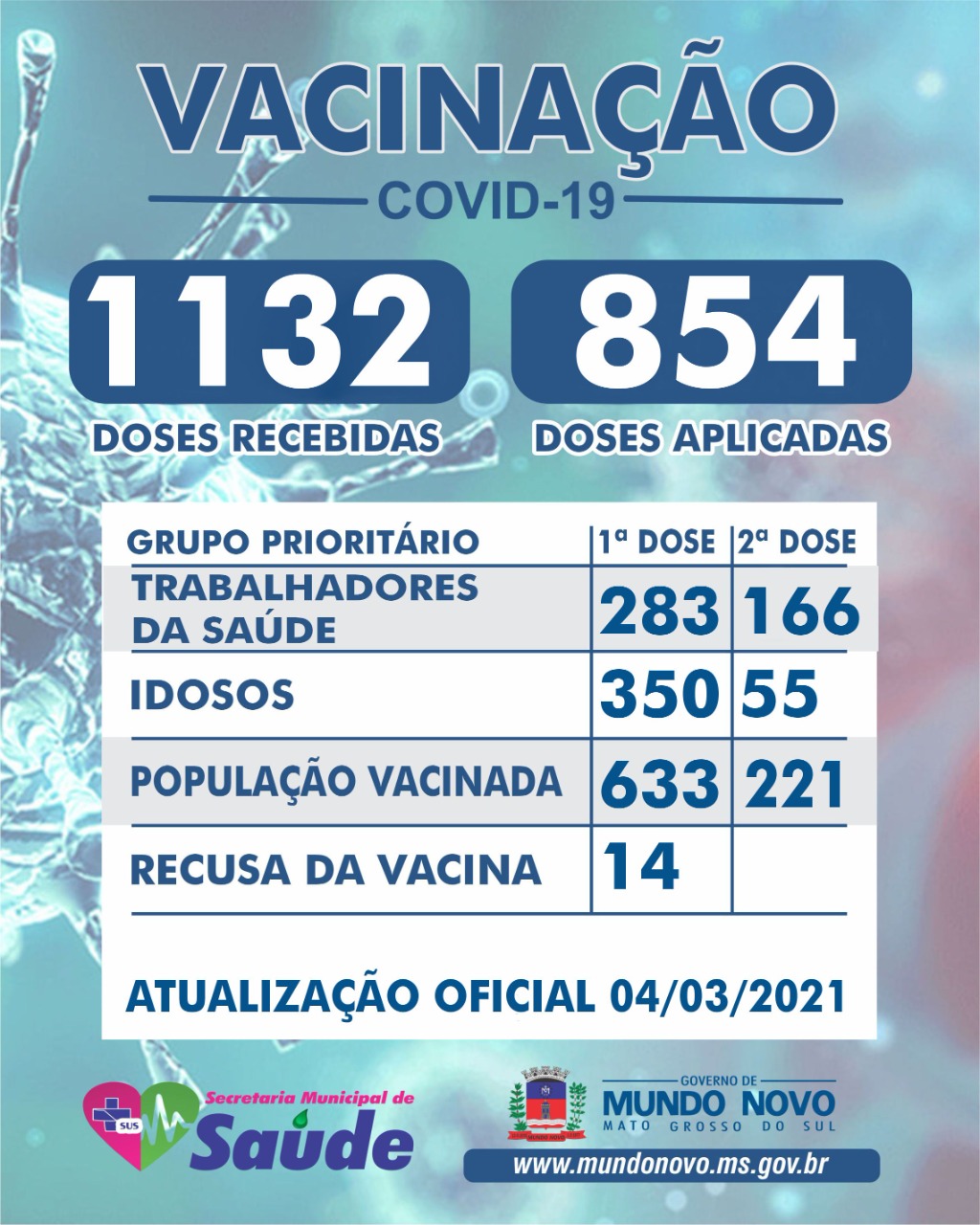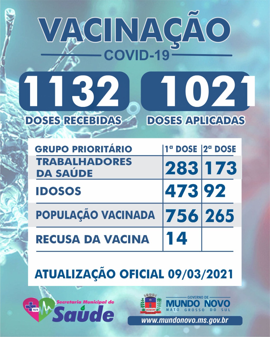 Vacinas Recebidas – 1.132: CoronaVac – 822 (461 primeira dose + 271 reservada para segunda dose + 90 a ser definida); AstraZeneca – 310 (primeira dose); Recusa da Vacina – 14. População Vacinada – 607: Lar São Francisco de Assis – 31 (Funcionários e idosos); Profissionais de Saúde – 274; Idosos acima de 80 anos – 209 (acamados e domiciliados) Idosos acima de 80 anos – 93 (andantes). População Vacinada 2ª dose – 176 02-03-2021 13:02